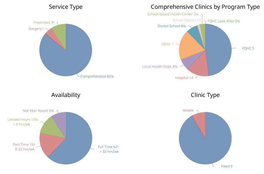 The following pie charts show the distribution of safety net dental clinics in Ohio. The pie charts are interactive: click on a label to see specific clinic information.